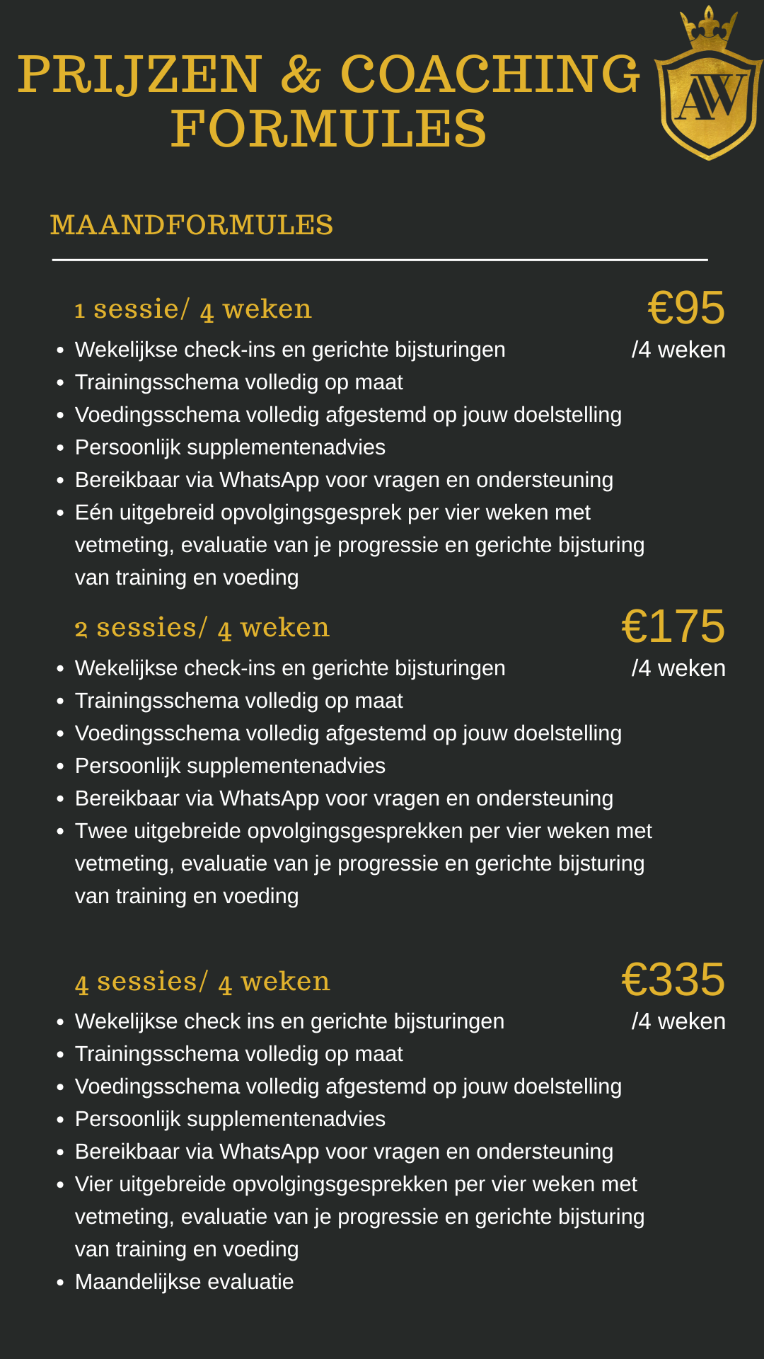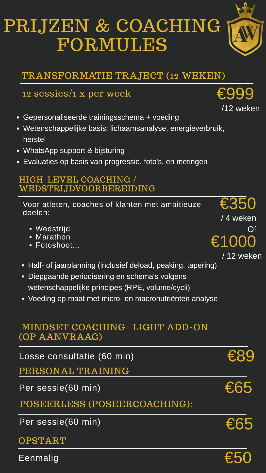 - Toegang tot de Teamwinnelinckx App: trainingsschema, voedingsschema, check-ins en progressie-opvolging